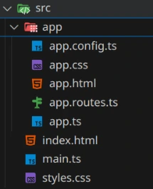 - Dentro de src, el directorio app contiene el componente principal de la aplicación, App, así como el resto de componentes que vayamos creando. También contiene el archivo de configuración global de la aplicación app.config.ts, y el archivo de rutas principal (app.routes.ts).