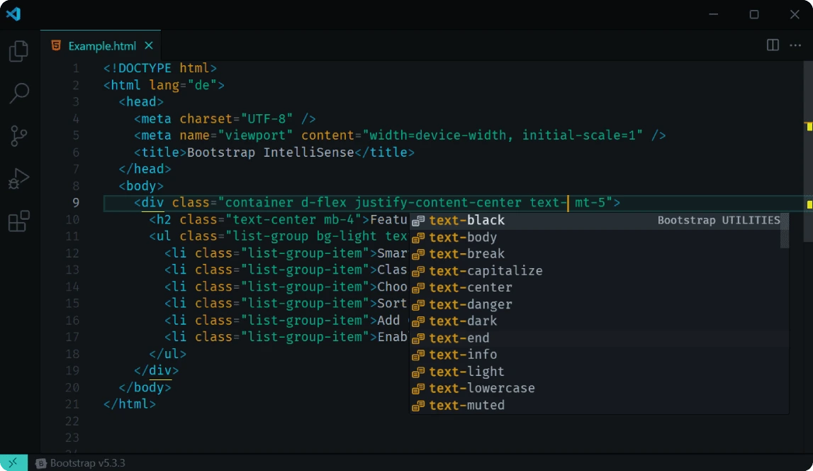 Bootstrap IntelliSense es una extensión de Visual Studio Code que mejora la experiencia de desarrollo con Bootstrap. Ofrece autocompletado de clases CSS, vistas previas al pasar el ratón (hover), ordenamiento de clases y la capacidad de elegir entre múltiples versiones de Bootstrap.