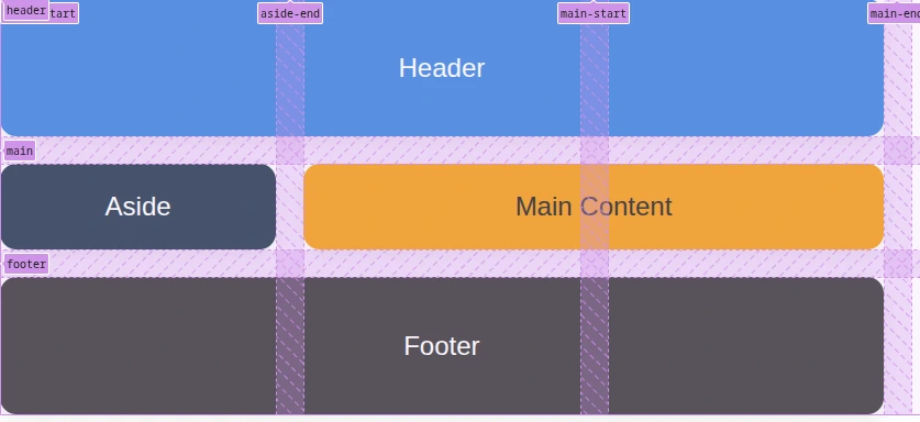 Simplemente colocas el nombre de la línea dentro de los corchetes [] antes o después de la definición del tamaño de la pista. El navegador creará 3 col-start y 3 col-end. Y podremos acceder a ellos mediante el índice que ocupa. Por ejemplo, en el típico ejemplo de web HTML5, el header sería desde col-start 1 / col-end 3, el main desde el col-start 2 hasta el col-end 3 dejando el aside desde el col-start 1 / col-end 1.