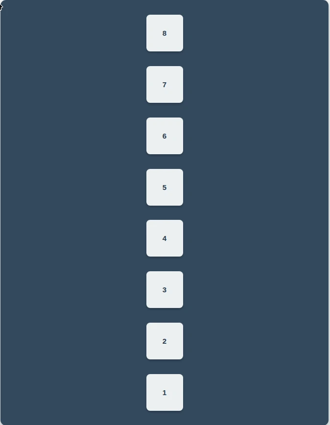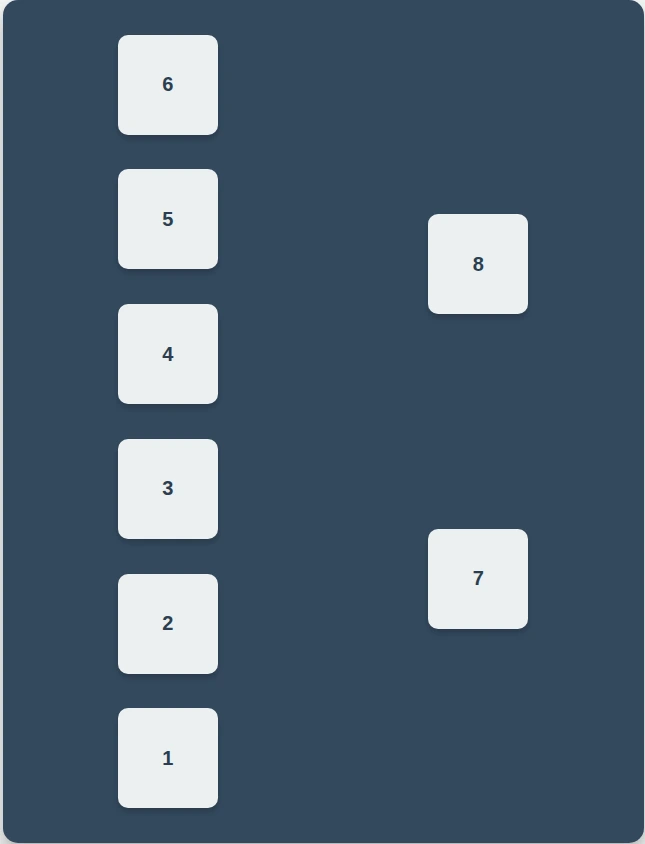 </html>El resultado es un conjunto de tarjetas que se organizan en múltiples columnas, centradas horizontalmente, y distribuidas verticalmente de manera espaciada, con el ítem '1' en la parte inferior de la primera columna y el ítem '8' en la parte superior de la última columna.