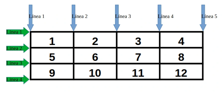 Situar los items en un grid es una de sus características más potentes. Lo haces indicando en qué líneas de la cuadrícula deben empezar y terminar. Primero, la idea clave: un grid de 4 columnas no tiene 4 espacios, sino 5 líneas verticales (azul). Lo mismo pasa con las filas (verde).