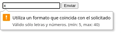 </form>Cuando queremos personalizar el mensaje de validación en un determinado input, usaremos el atributo title seguido del mensaje. Es importante tener en cuenta que si el campo es required, lo primero que hará será decirnos que el campo no puede estar vacío, una vez que hayamos insertado algún caracter pasaría a mostrarnos el mensaje de error.